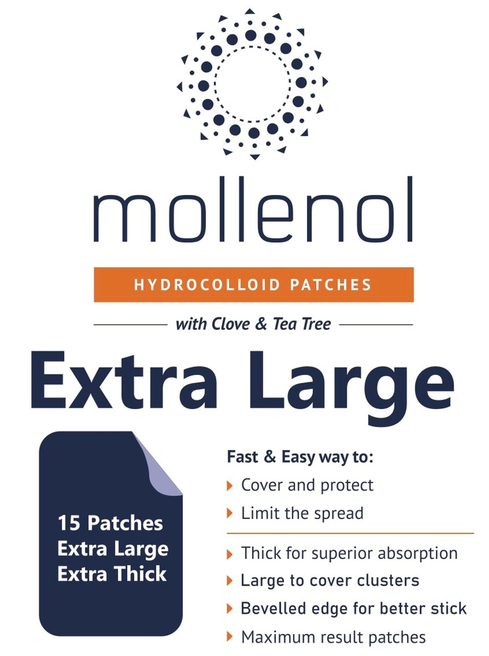 Mollenol Extra Large Patches are a special hydrocolloid pimple patch designed for application for large clusters of skin eruptions and bumps on the body, arms and legs.